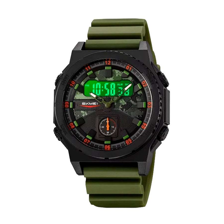 Наручний годинник SKMEI 2355AG – це сучасний аксесуар, який поєднує в собі стиль, практичність та багатофункціональність. Його дизайн розроблений у військовому стилі, що робить модель ідеальною для активних людей, любителів спорту та outdoor-відпочинку. Завдяки поєднанню аналогового і цифрового відображення часу, користувач отримує зручність і точність у будь-яких умовах. Великий корпус із міцного ABS-пластику та ремінець з TPU забезпечують довговічність та комфорт під час носіння. Годинник оснащений календарем, будильником, секундоміром і яскравим підсвічуванням, що дозволяє користуватись ним навіть у темряві. Водозахист 50 метрів робить модель придатною для плавання, занять спортом та повсякденного використання.